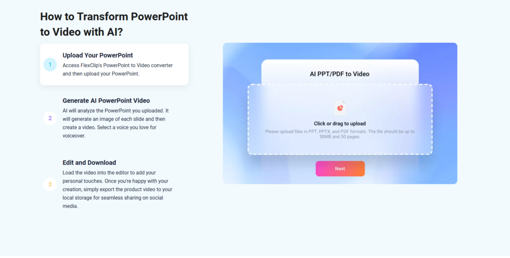 “First, head over to the FlexClip website and find the ‘FlexClip AI PPT to Video‘ tool. Click the upload button and select your PowerPoint file from your computer. It takes just a second to load.”