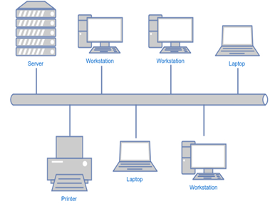 Bus topology is differ from above three, because it has multipoint configuration. In these nodes are connected to the bus cable by droplines and tap. A drop line is a connection between the nodes and main cable.A tap is a connector used to contact with the metallic core of the main cable and droplines. Some advantages of bus topology are: