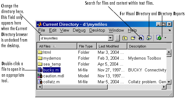 In MATLAB, Current Directory browser is useful for searching, viewing and help us to open and make some changes to MATLAB related directories and files. Alternatively, we can use the dir